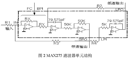 MAX275集成度高,参数调整方便。给工程项目人员带来了极大得方便。通过外接的不同器件组合,MAX275可构成多种滤波器,如中心频率可调的带通滤波器。