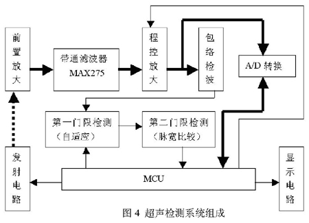 其内部的一个二阶节单元如图2所示。当用于低通滤波时用LPO作为输出,当用于带通滤波时用BPO作为输出。二阶节的中心频率Fo、Q值及放大倍数由外接电阻R1、R2、R3、R4决定。当中心频率Fo、Q值及增益确定后,R1、R2、R3、R4可由下列等式得到(所得电阻值单位均为 ): R2=2 109/Fo R4=R2-5K  R3=(2Q 109 RX)/(Fo RY) 对于低通滤波:R1=(2 109 RX)/(Fo Holp RY) 对于带通滤波:R1=R3/Hobp 式中,RX/RY因子中RX和RY是滤波器内部的电阻,这个因子的值由引脚FC的接法决定。为了提高中心频率Fo和品质因数Q值的精度,FC脚应尽可能接地。Holp是用于低通滤波时,频率为0时引脚LPO处的增益;Hobp是用于带通滤波时,频率为Fo时引脚BOP处的增益。 或者,更为方便的设计方法是使用MAXIM274/275有源滤波器设计软件(在MAXIM网站上可免费下载),其主要功能是: (1)根据滤波器的性能指标,如通带内的最大衰减,阻带内的最小衰减,截至频率,带宽,Q值等,能迅速算出巴特沃思,切比雪夫,贝赛尔和椭圆滤波器的极点、零点、阶数和Q值等。 当选定由滤波器指标决定经典滤波函数后,可以在对话窗口中输入有关参数,通带内最大衰减,阻带内最小衰减,截止频率,通带宽度,阻带宽度等。之后,软件就会给出计算结果,说明要达到预定输入指标应选用各经典滤波函数的阶数。可以执行有关命令来改变滤波器的类型,查看响应曲线,列出极点清单,记录幅频、相频和延时传输特性并打印输出,并且给出滤波器的滤波方程。 (2)针对MAX275完成滤波电路设计,即计算出每个二阶节外接电阻的数值,然后进行仿真获得传输特性曲线,包括增益,相位和群延迟等,并打印出结果。 当选定用MAX275设计滤波电路时,只能选择偶数阶的巴特沃思,切比雪夫,贝赛尔型的低通,带通滤波器。执行相关命令后,程序会分析结果,自动装入数据,并显示各级的实际连接框图和外接电阻的阻值。需要说明一点,MAXIM有源滤波器设计软件的应用是建立在每个二阶节基础上的,即每片MAX275内有两个二阶节,就把这片MAX275分成两个级联单元来处理,给出外接电阻连接图也是两级分别给出。因为每一级的输出响应是相对于该级输入而言的,所以最后一级的输出也就是总输出,该软件最多可以分析12级级联单元。应该注意的是,在选中单元的电路图中若有大于4M 的外接电阻,根据MAX275器件的要求应作T-网络变换,把它换成3个小于4M 的等效电阻,这个过程可由程序计算完成。完成设计以后,可以将电路各级的指标与外接电阻数值全部打印出来。  需要补充的是外接电阻最大不应超过4M ,因为这时寄生电容的影响会比较明显,造成过大的Fo/Q误差。外接电阻最小也不应小于5K ,这是由运放的驱动能力所决定的。当计算出的外接电阻值大于4M 或小于5K 时,可以通过改变FC的接线位置来调整或者用这个电阻的等效电阻T-网络来代替。 另外,MAX275外接一个运放和外接电阻组合就可以实现陷波器,具体实现方式及器件选择参见产品手册。 超声检测系统组成