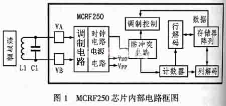 2.1 芯片内部电路组成     MCRF250芯片内部电路框图及与读写器构成的应用系统如图1所示。芯片的引脚VA和VB外接电感L1和电容C1构成的谐振电路(谐振频率为125KHZ, L1参考值为4.05MH,C1参考值为390PF)。读写器(READER)侧的电路谐振于125KHZ以用于输出射频能量,同时也用于接收MCRF250芯片以负载调制方式传来的数字信号。MCRF250芯片内部电路由射频前端、防冲突电路及存储器三部分组成。
