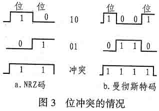 位冲突检测可以采用幅度变化、非法编码出现、位宽变化等检测技术。但在RFID中,很难确定判断幅度迭加的门限值(阈值),因此,非法编码判断和位宽检测是比较简便的方法。       非法编码判断和编码方式的相关资料可参见参考文献。下面主要介绍NRZ码和曼彻斯特码在发生冲突时合成波形的变化情况。从图3中可见,NRZ 码无法判断位0和位1的冲突,因为冲突后的结果可认为正常的数位1。而曼彻斯特编码的数位1,如果以速率高一倍的NRZ码10来表示,其数位0则可表示为01,其数位1和数位0冲突的结果则可表示为11,而曼彻斯特码中,11是非法编码,故而极易判断位冲突出现。TYPE A中就是采用了曼彻斯特编码。当然,图3所示情况是基于位时间同步和放大限幅的环境,在RFID中,这些都是可以做到的。          而位宽的变化则与调制方式有关。当采用NRZ码FSK调制时,发现位0和位1碰撞时,其合成波形的位宽有了比较明显的变化,图4所示是其碰撞情况时序图,图中数位0为FC/8,数位1为FC*10。