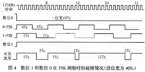 从图4可以看到,经过滤波放大整形电路后,若数位1和数位0产生碰撞,则碰撞冲突后的波形将出现7TC和12TC宽的脉冲,而正常情况下0的FSK脉宽为4TC,1的FSK脉宽为5TC,因此用计数器进行位宽检测,判别是否出现大于5TC的脉宽,就可以判断是否出现了冲突。