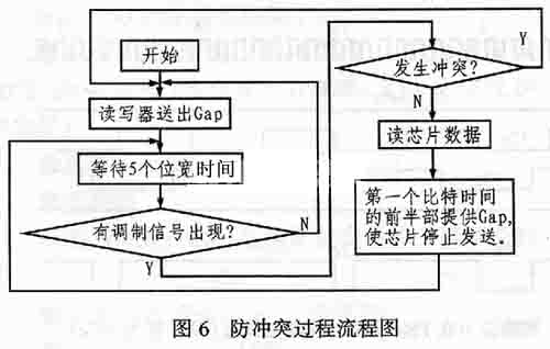 MCRF250的防冲突流程图如图6所示。读写器开始送出GAP,其时间间隔(载波缺损时间)为60μs(误差不大于20%)。然后等待5个位宽时间,检测有无调制信号出现,若有调制信号出现,再判断是否发生冲突。如果无冲突出现,则读完该MCRF250芯片数据后,再按规定形成一个新的GAP,以进行下一次读取。