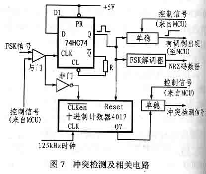冲突检测电路由十进制计数器4017和单稳电路组成。4017的 RESET端接至触发器D1的Q端,触发器D1的Q端输出用于复位4017并使其开始计数。从图4可知,如果产生位碰撞,就会出现7TC和12TC的脉宽,因此将FSK信号加至4017的CLKEN端,该端为低时,对125KHZ时钟计数,当计数到7时,Q7端由低变高,触发单稳电路,单稳电路产生跳变(此即冲突出现信号),并告知MCU发生了冲突。在正常FSK信号情况下,FSK脉宽为4TC和5TC,因此Q7脚不会变高,即无位碰撞出现。该电路可实现位冲突检测。MCU输出的控制信号用于设置图7电路的初始状态。